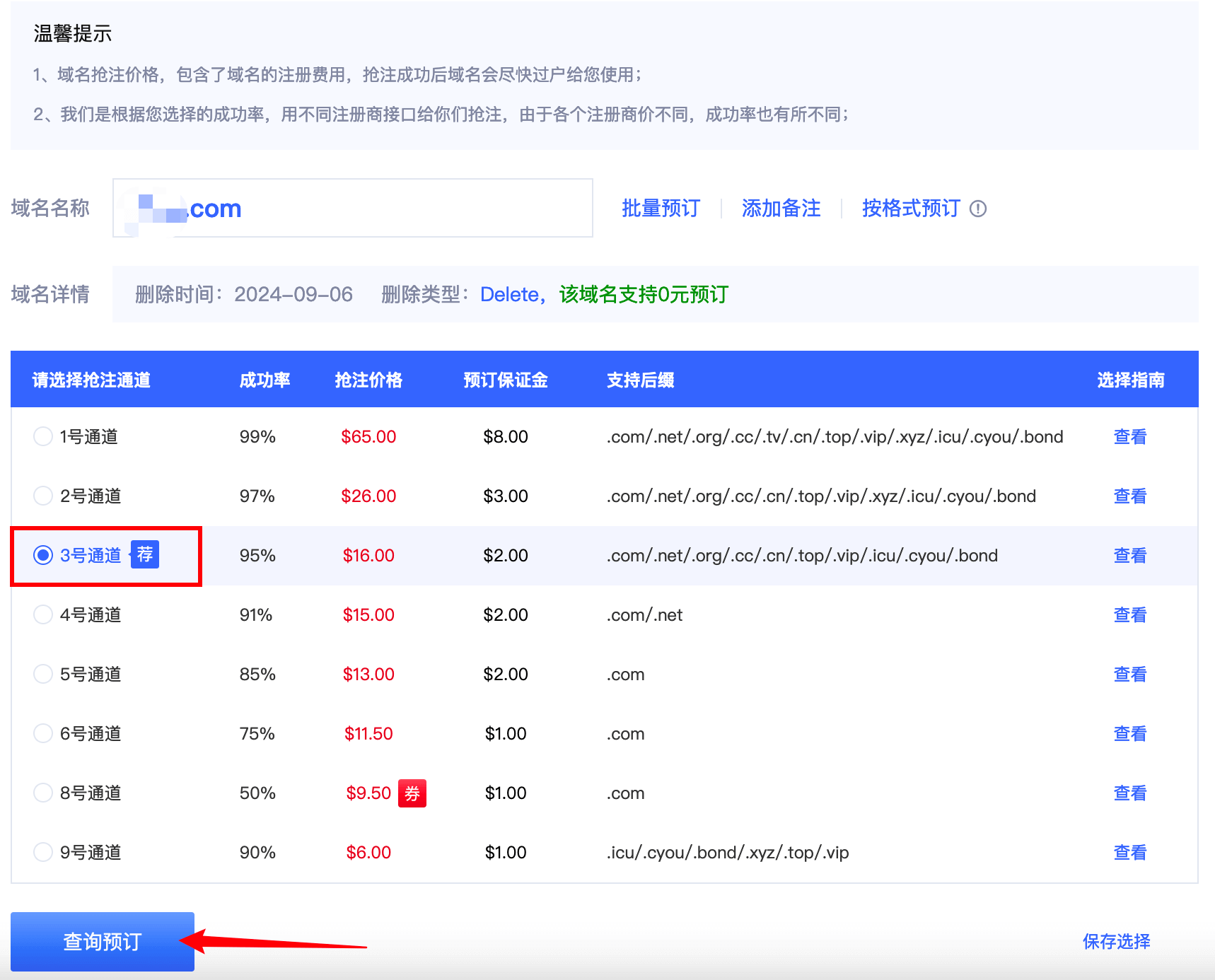 进入到预定通道页面选择1个通道,点击【查询预定】;确认域名预定信息无误后,点击【立即预定】即可进入支付环节。